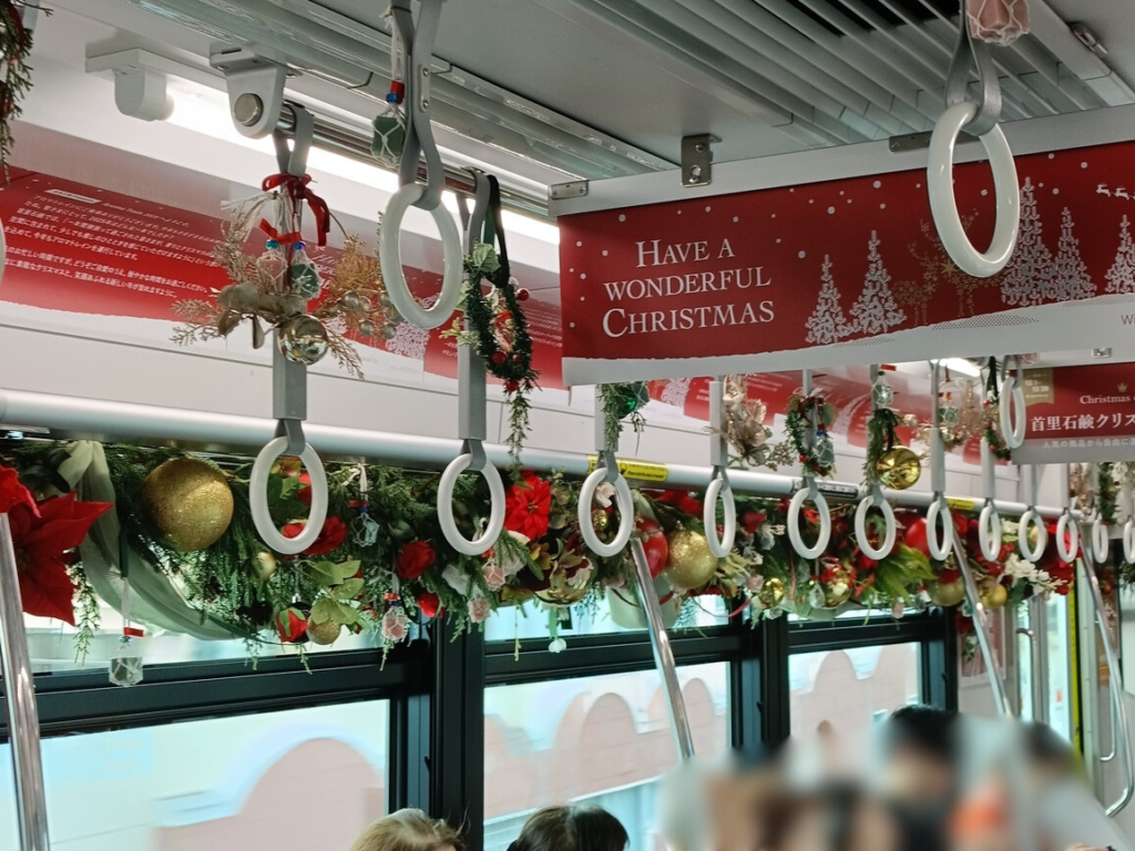 なんと、クリスマスのデコレーション仕様でした。荷物棚下や吊革一つ一つに装飾されていて、しかも中刷り広告までもがクリスマス仕様で東一されていて印象的でした。私も思わず写真を撮りましたが、他の観光者さんも同じ行動でしたね。これで、よそ者とのふるいに見事にかけられました!まあでも、きれいな車両に乗れて良かったです。