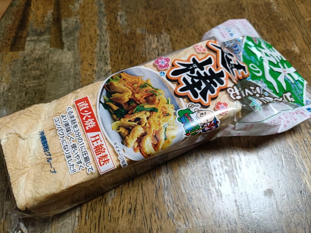 「麩チャンプル」用の麩です。どのスーパーにも何種類かの麩が置いていると思いますが、我家ご指定の麩は「圧縮麩」タイプです。圧縮タイプは、普通の麩を3分の1にまで縮んでいるので、通常タイプより3倍の量を輸送できます。少しでも多く購入できれば、我家の食卓に麩チャンプルが登場する頻度もあがるというわけです。