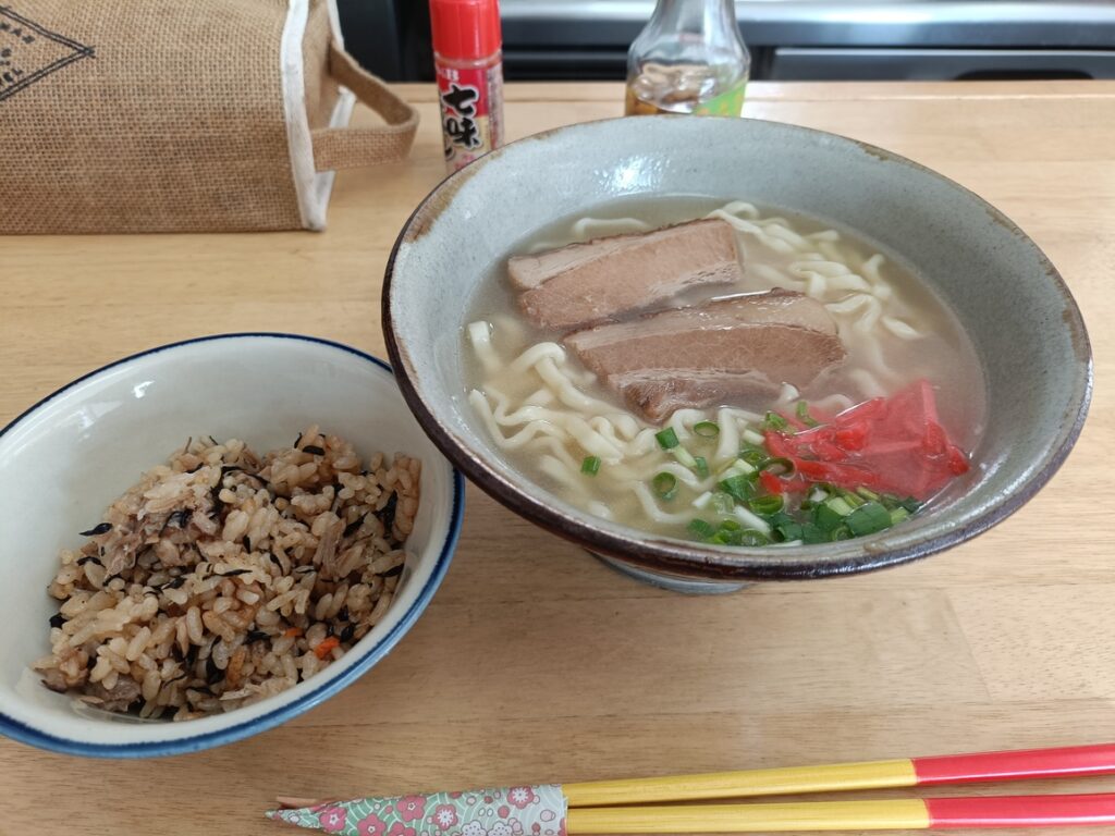 こちらのメニューはとてもシンプル。沖縄そばとかき氷のみ。私は沖縄そばを食べたかったので、ソーキにしようかとも思いましたが、ここは三枚肉そばに、じゅーしーを頼みました。ひとり、海外の若い男性が隣に座っていて食べ終わるタイミングで、全く日本語ができないのか、なんとなくの英語で会計をして出ていきました。実際そばを調理しているのは、おばあちゃんの娘さんなのか、厨房に一人できりもりしているようです。来店のタイミングが良かったです、その後、お客さんが立て続けにきて、小さな店内は直ぐに満席となりました。