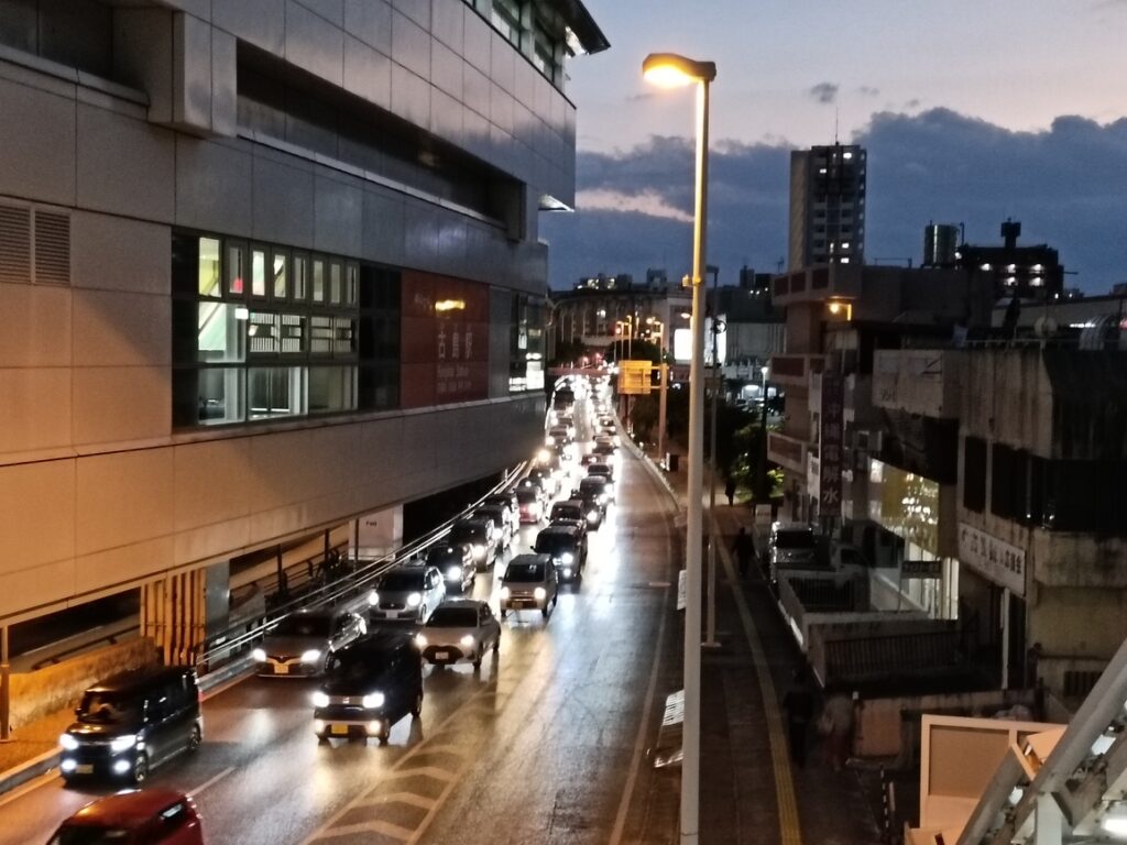 17時を過ぎた那覇中心部。観光地とビジネス街の境目なのでしょうか、ビジネスマンが行き交いますが、スーツ姿にコートをはおっている人はいませんでした。上着を着ていない人も見かけました。