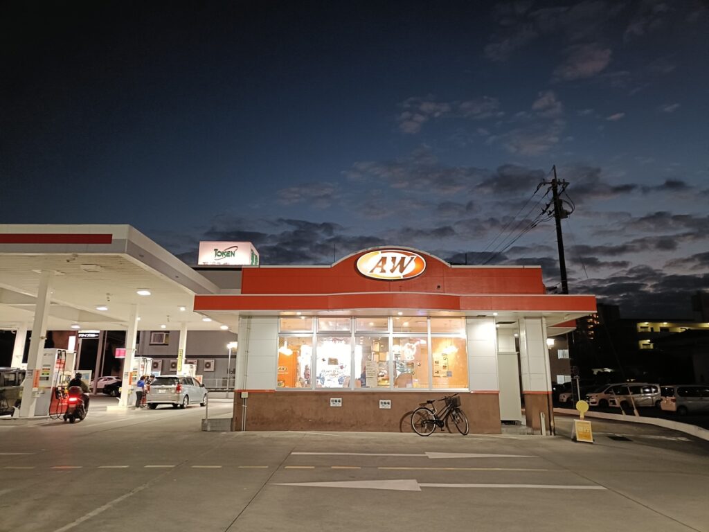 このお店はガソリンスタンド併設店です。ちなみに、A&Wは日本だと沖縄にしかないハンバーガーチェーンです。